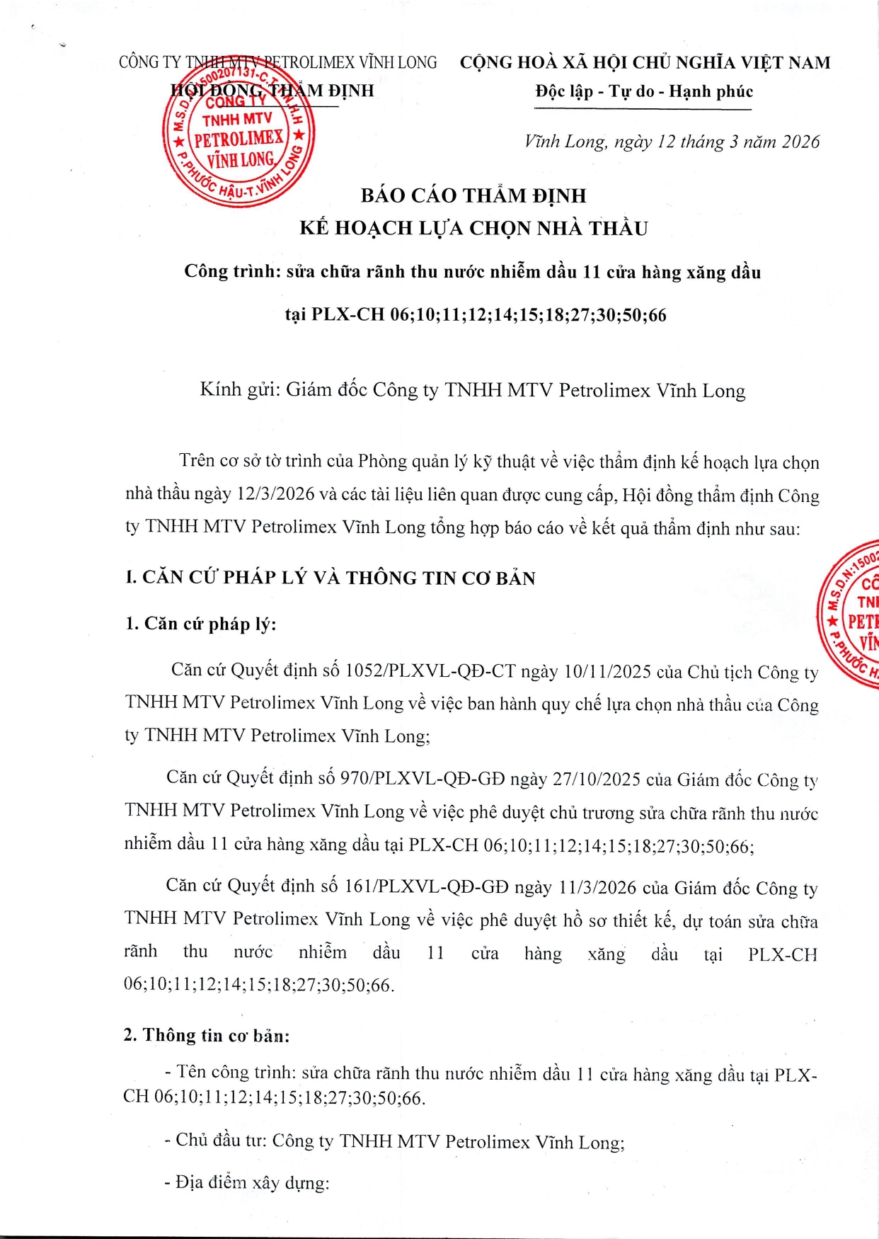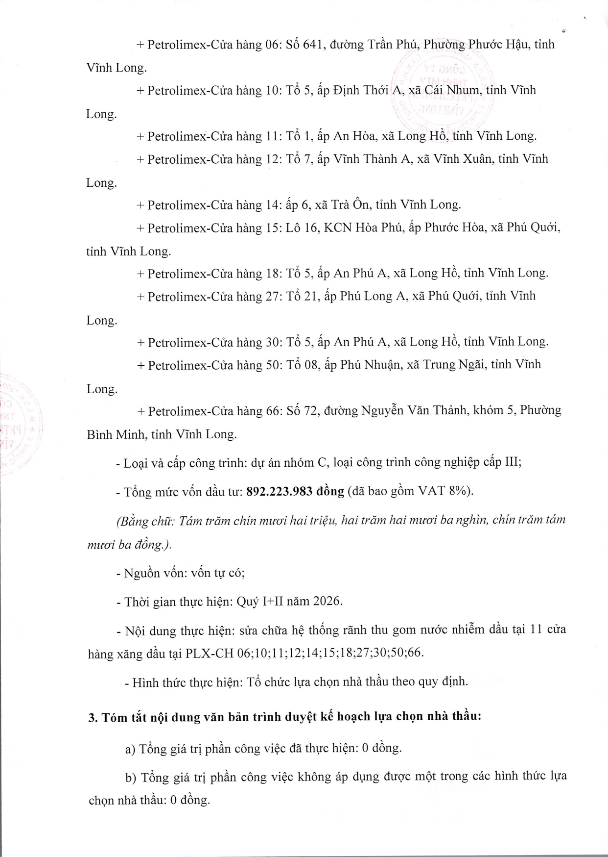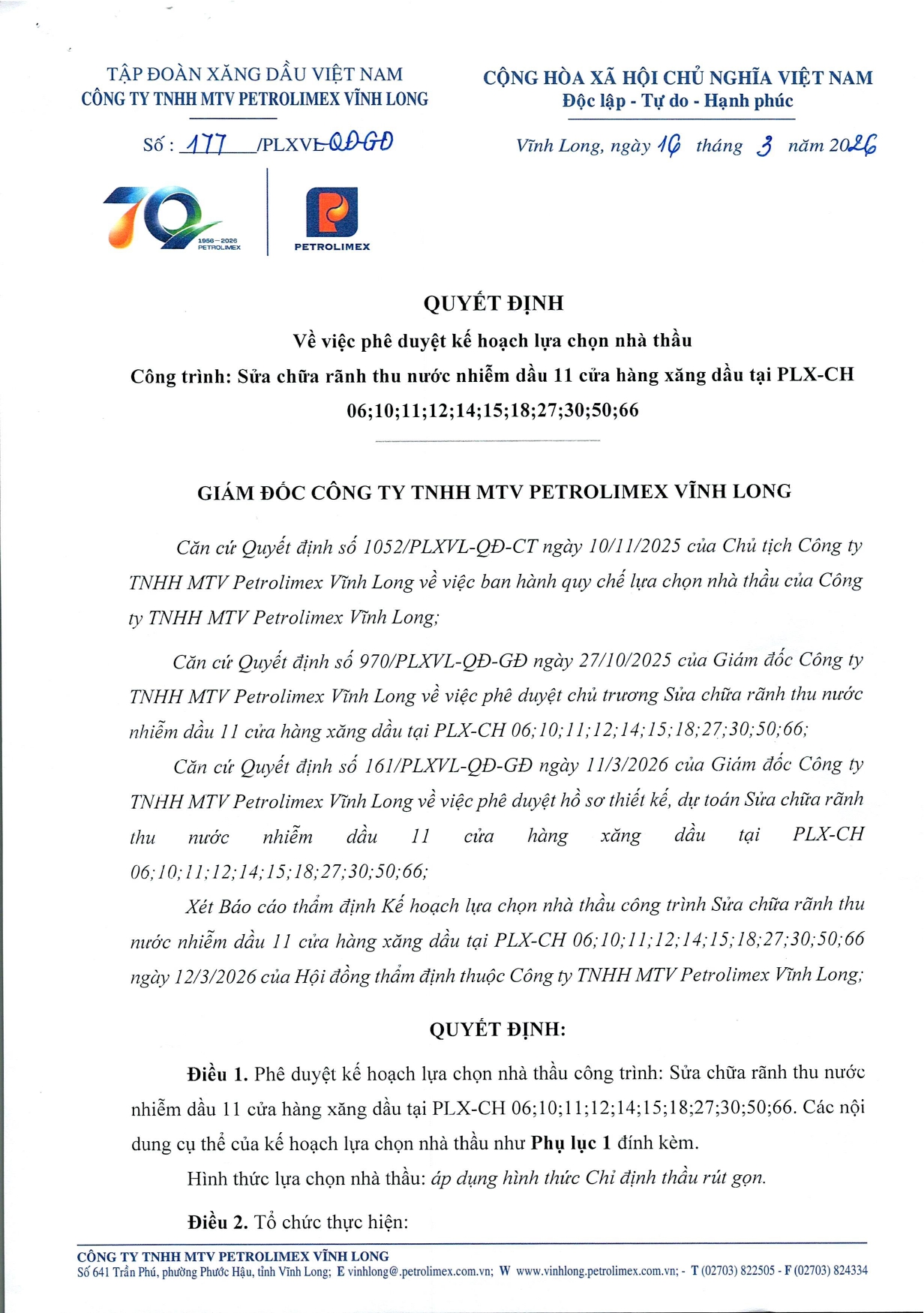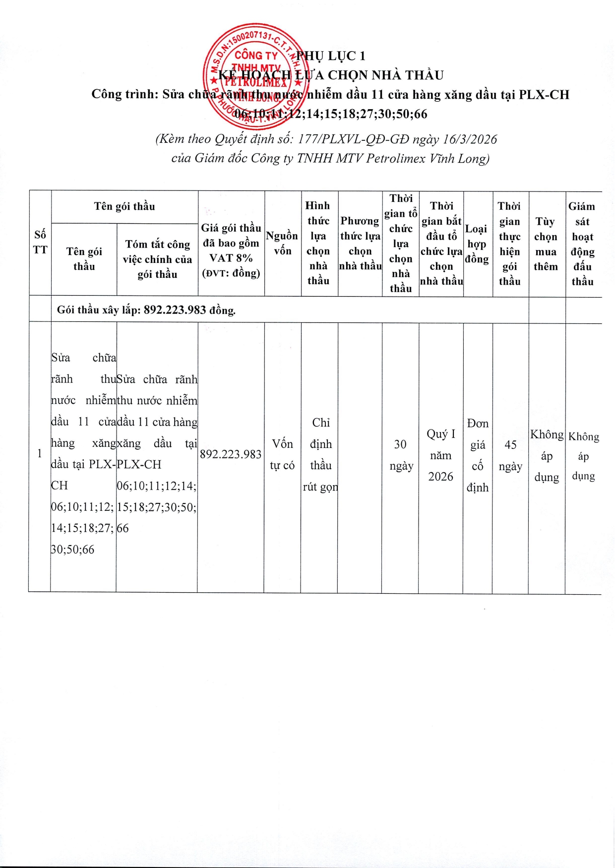 Quyết định về việc phê duyệt kế hoạch LCNT công trình: Sửa chữa rãnh thu nước nhiễm dầu 11 cửa hàng xăng dầu tại PLX-CH 06;10;11;12;14;15;18;27;30;50;66