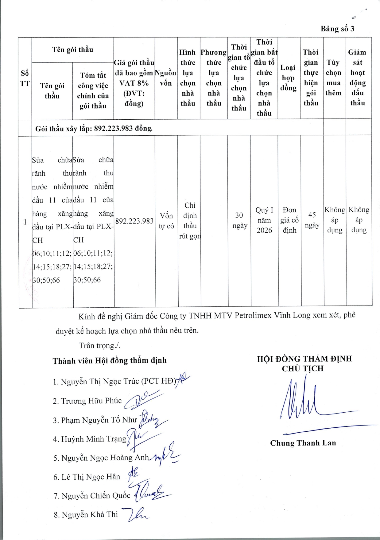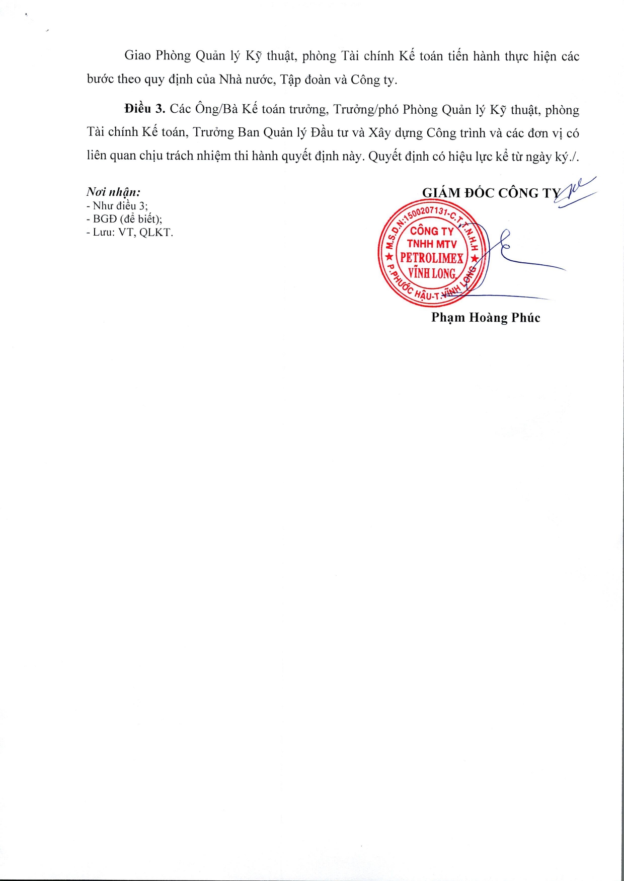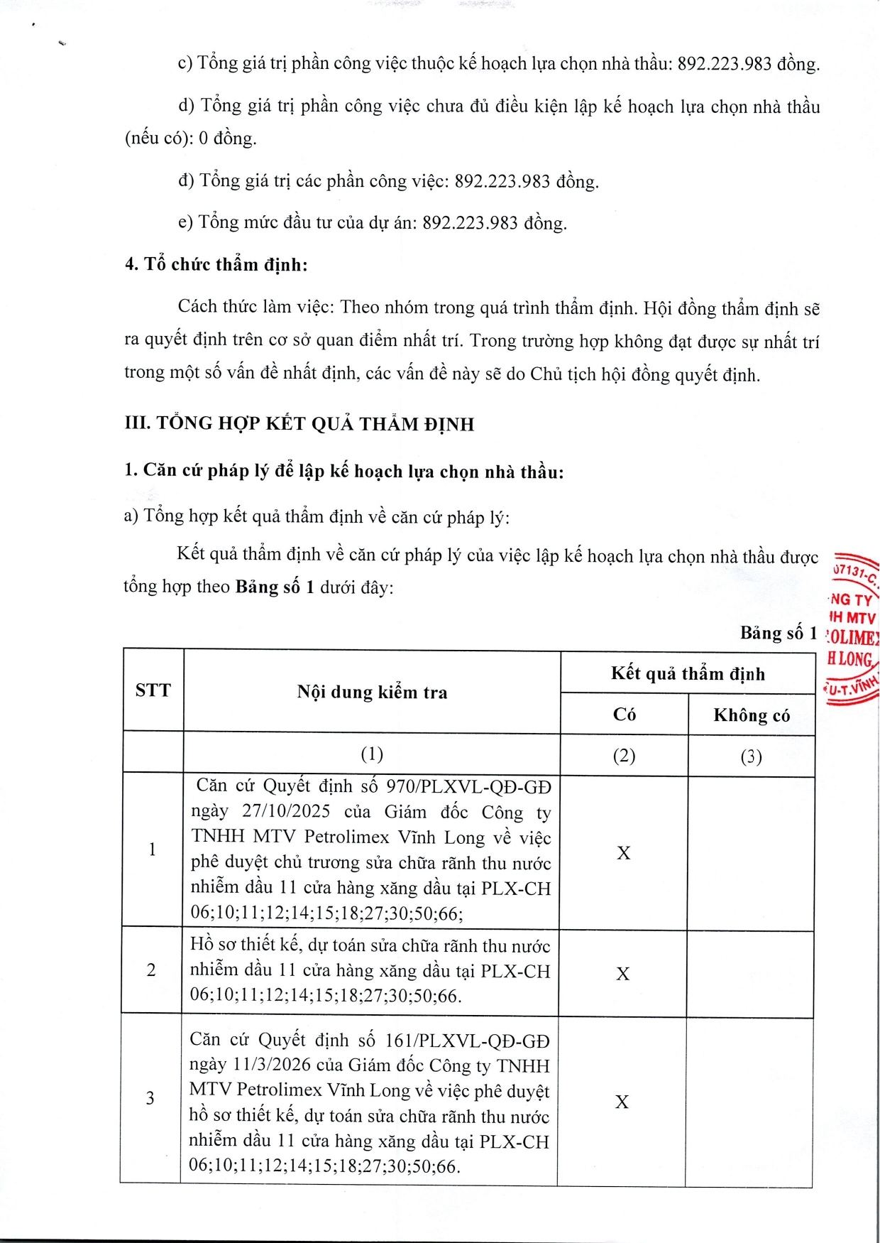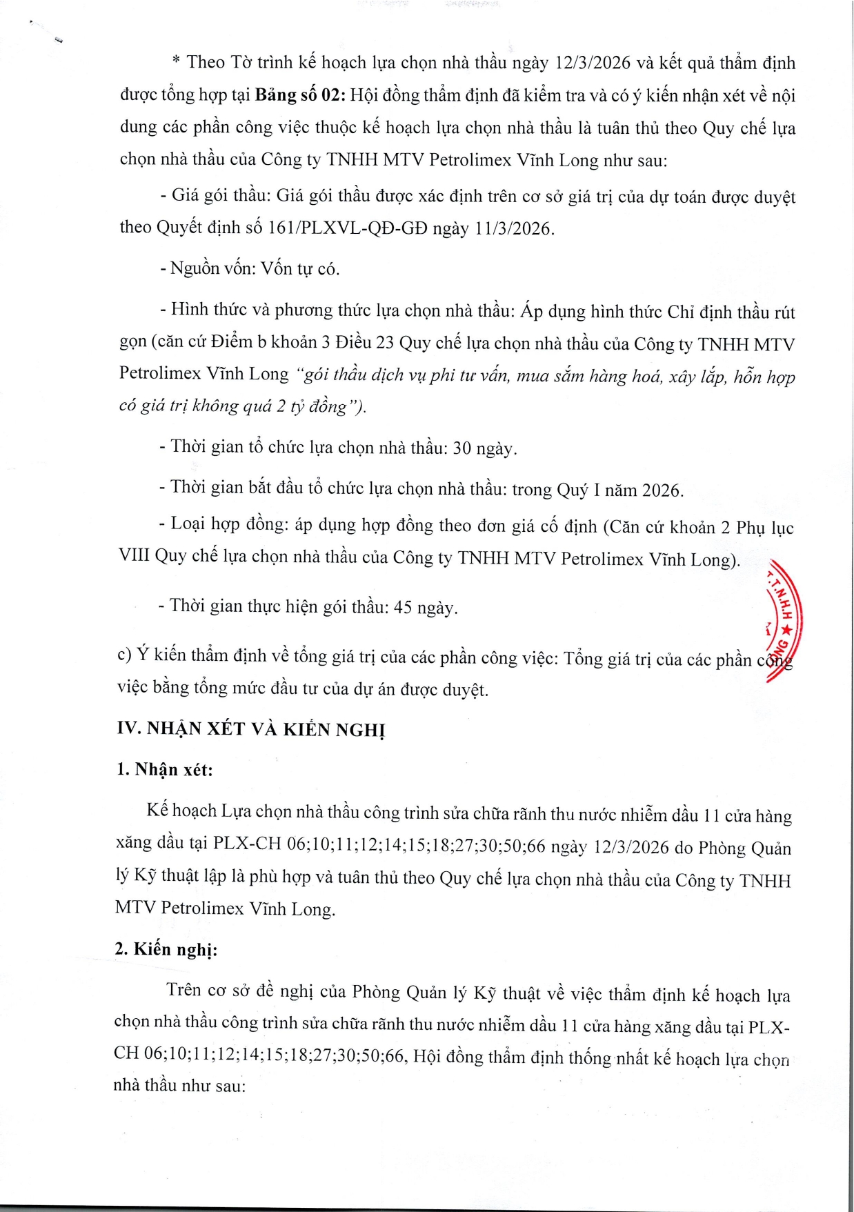 Quyết định về việc phê duyệt kế hoạch LCNT công trình: Sửa chữa rãnh thu nước nhiễm dầu 11 cửa hàng xăng dầu tại PLX-CH 06;10;11;12;14;15;18;27;30;50;66