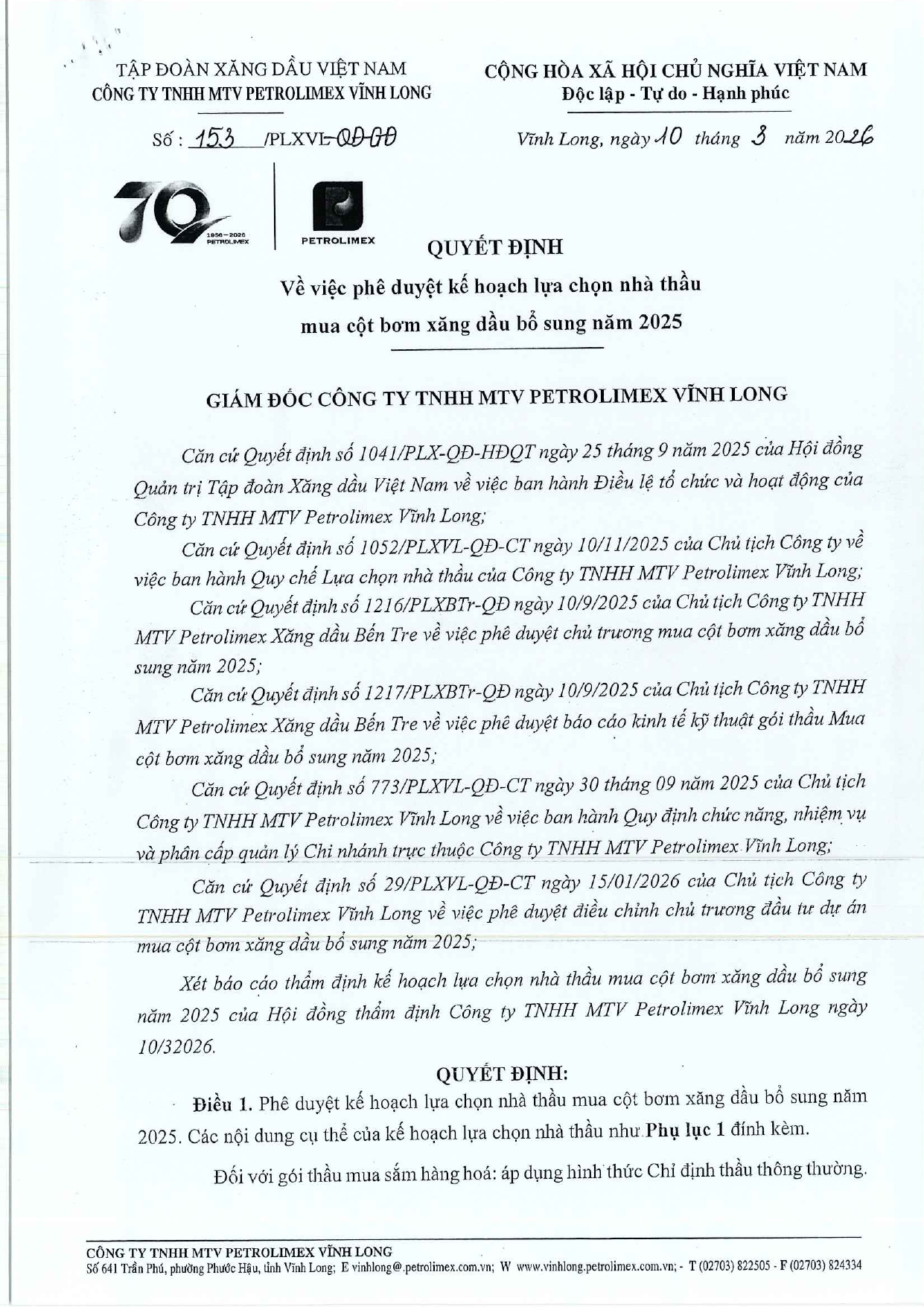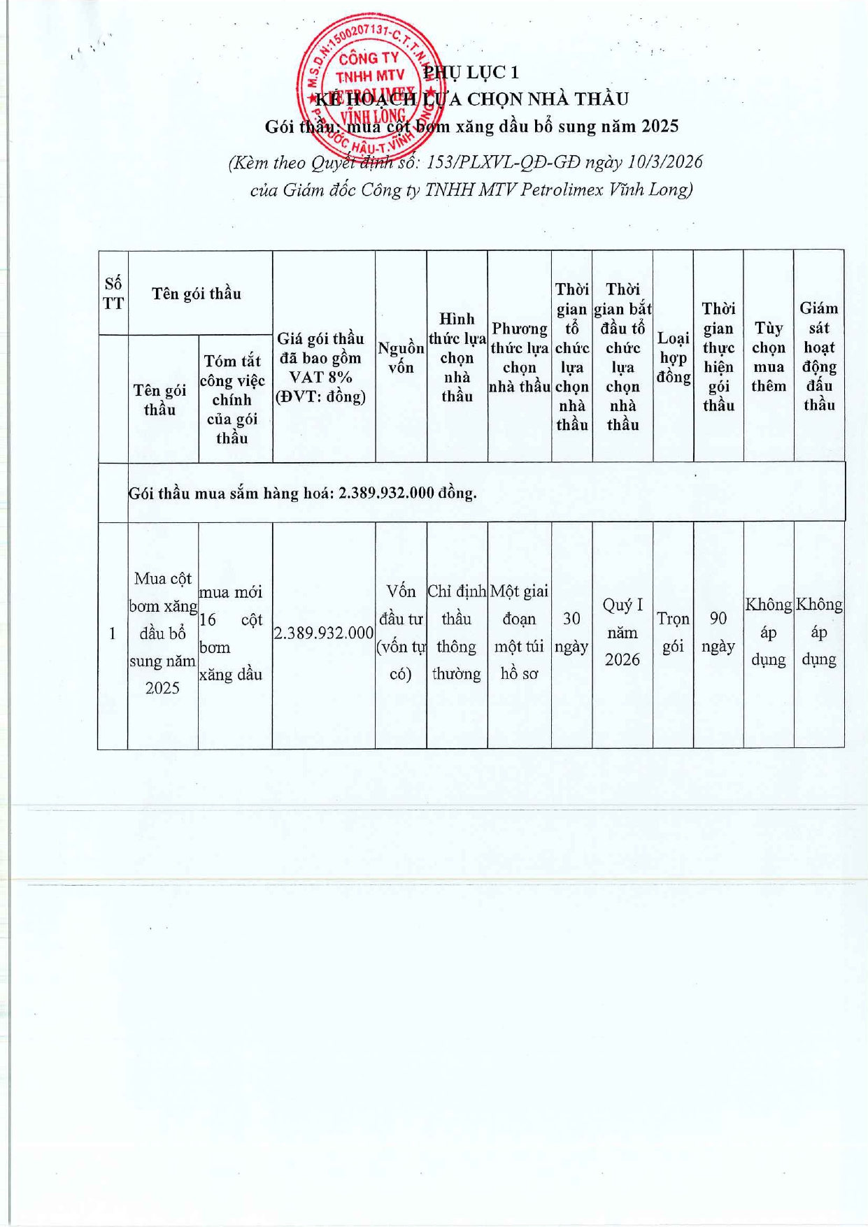Quyết định về việc phê duyệt kế hoạch LCNT mua cột bơm xăng dầu bổ sung năm 2025